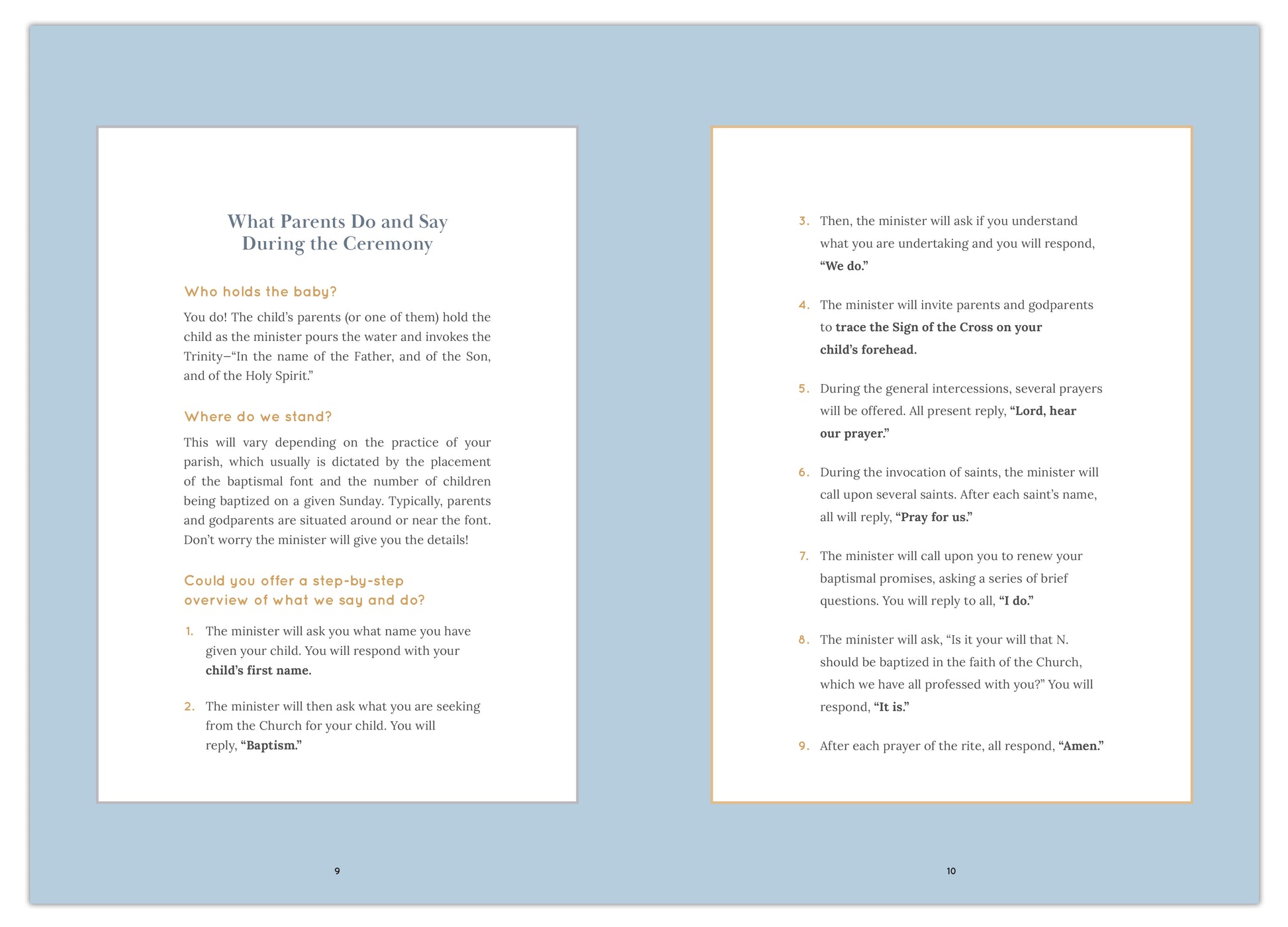 - The Parent’s Guide paints a picture of how their child’s heart, soul, and life will be transformed by their baptism into the Catholic Church.