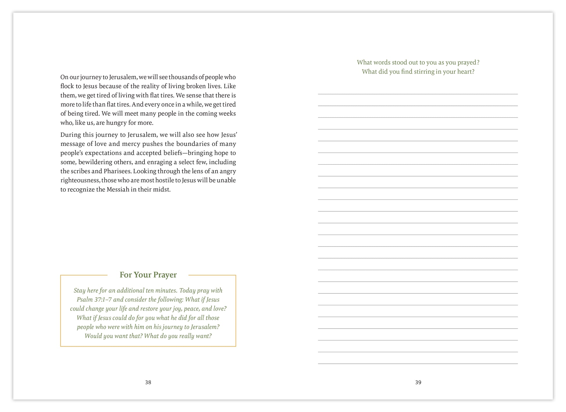 I am so glad that this journal guided my Lent this year. I truly mean it when I say it changed my life and deepened my relationship with God. I felt like it was written for me specifically. The growth and connectedness I gained from this journal was invaluable. I am so grateful to the author and to Ascension for publishing it and couldn't recommend it more! I will be revisiting it throughout the year to repeat the guided meditations because they were so powerful.