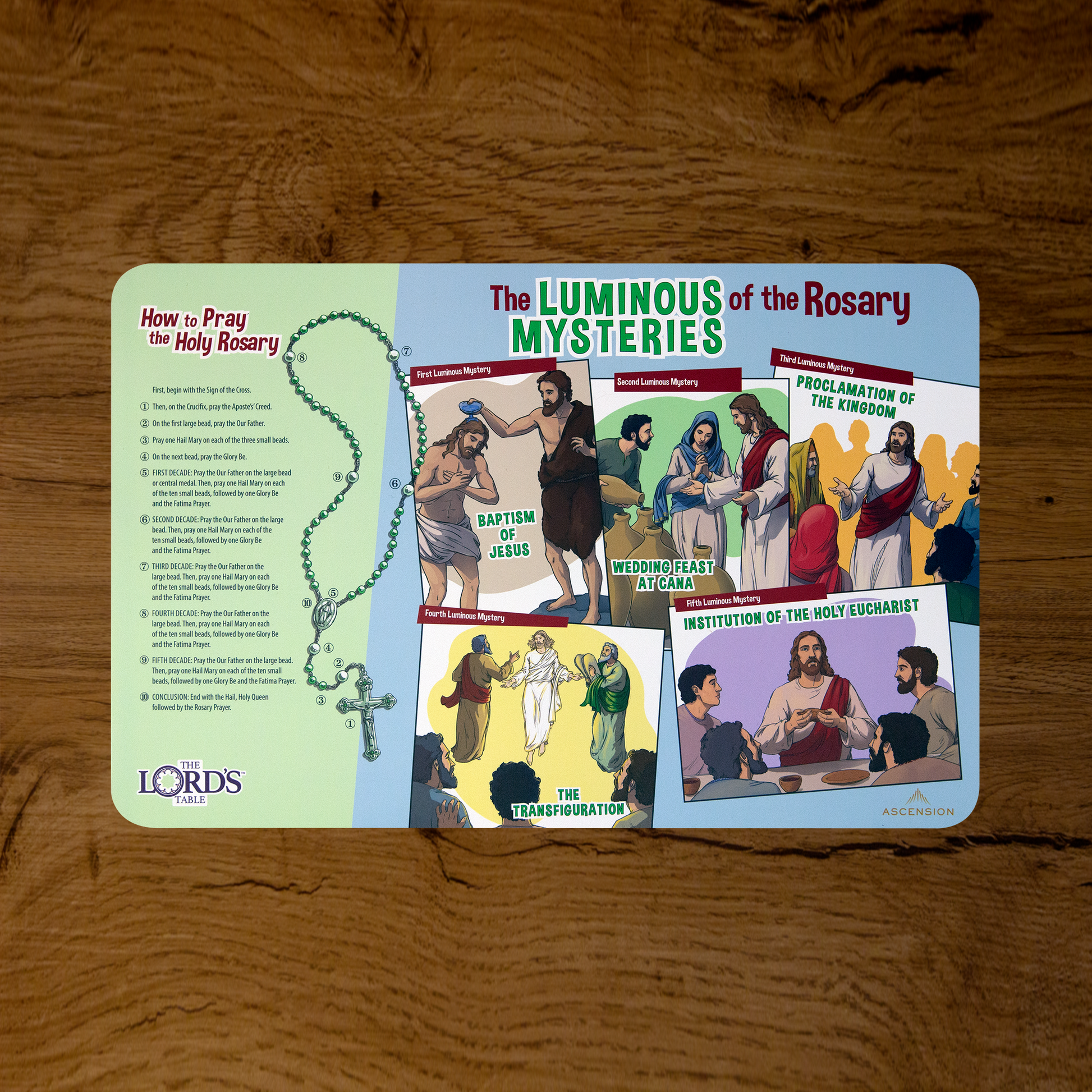 The How to Pray the Holy Rosary Placemats are a catechetical tool for Catholic families that beautifully illustrate the instructions for the holy Rosary.