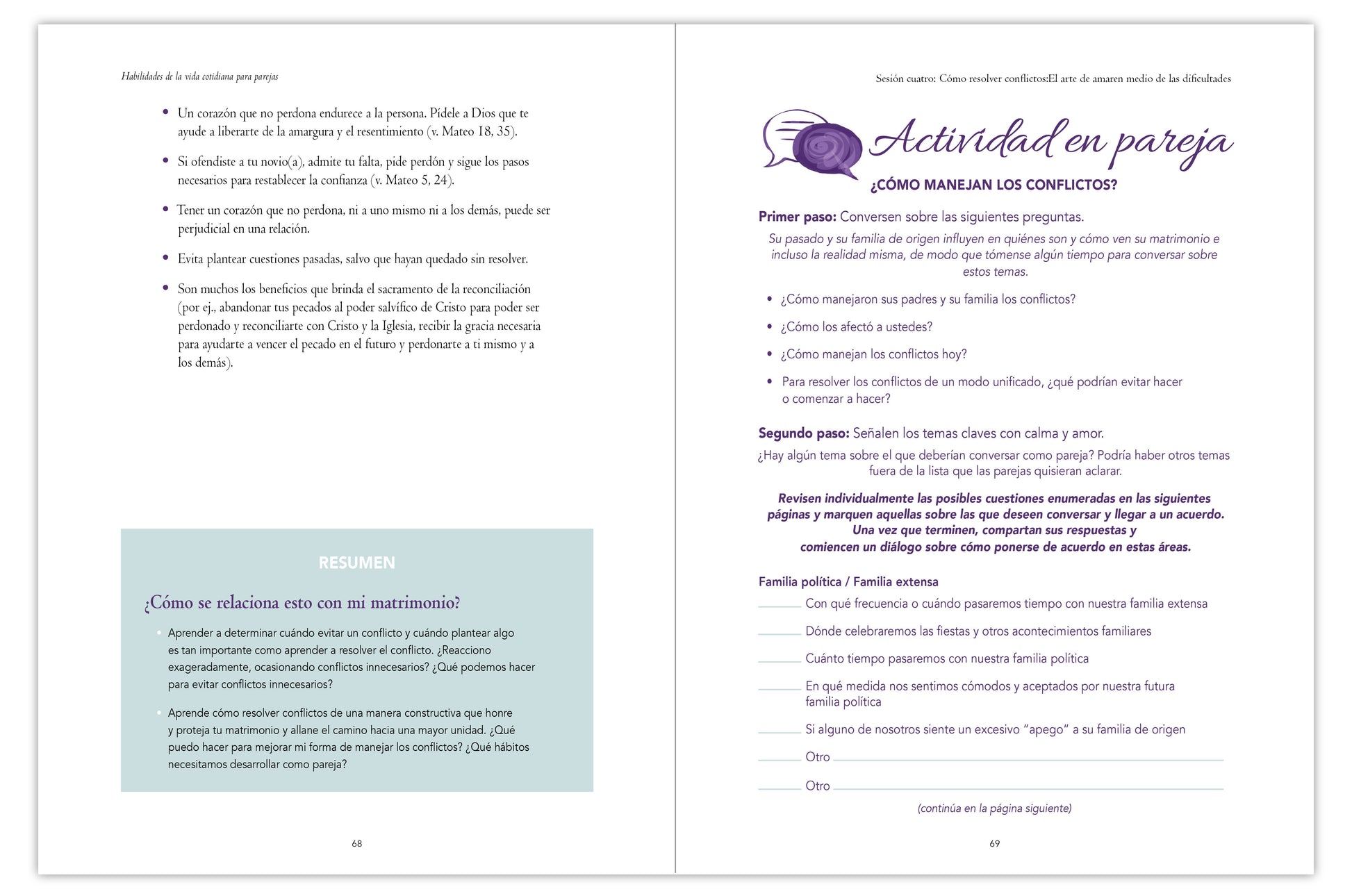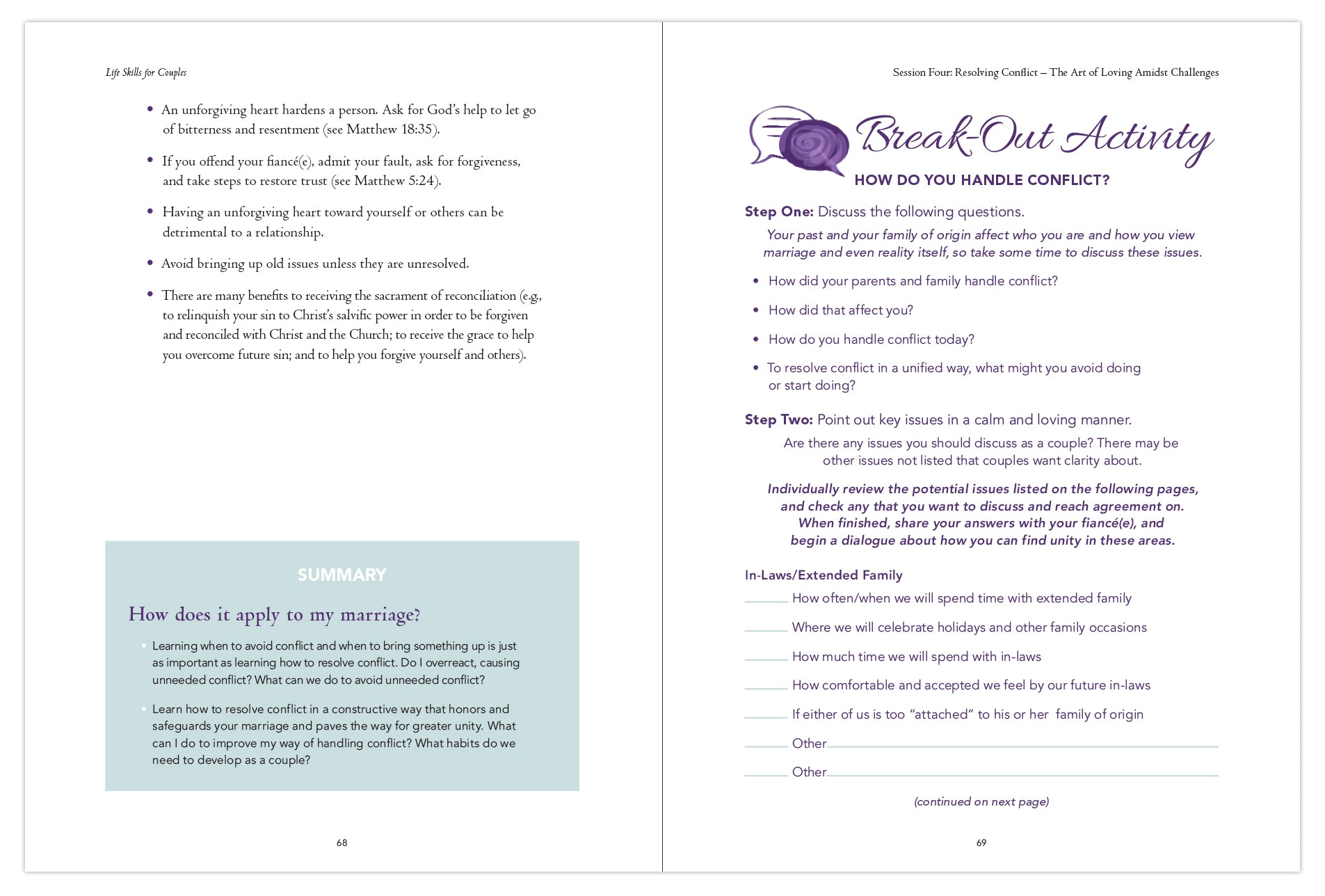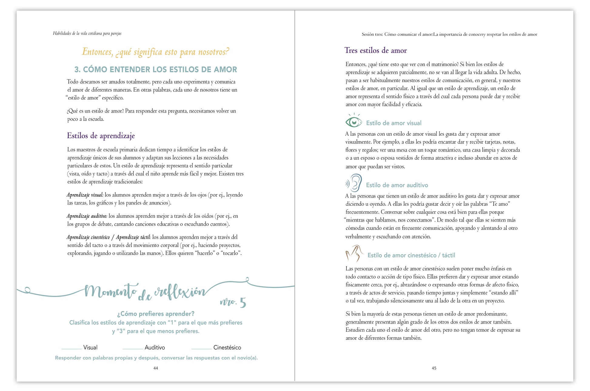 It is designed for each engaged person to have a copy of his/her own, in order to first absorb the content, then to share their thoughts with one another. The Couple’s Guide is created to accompany the corresponding lessons from the videos.