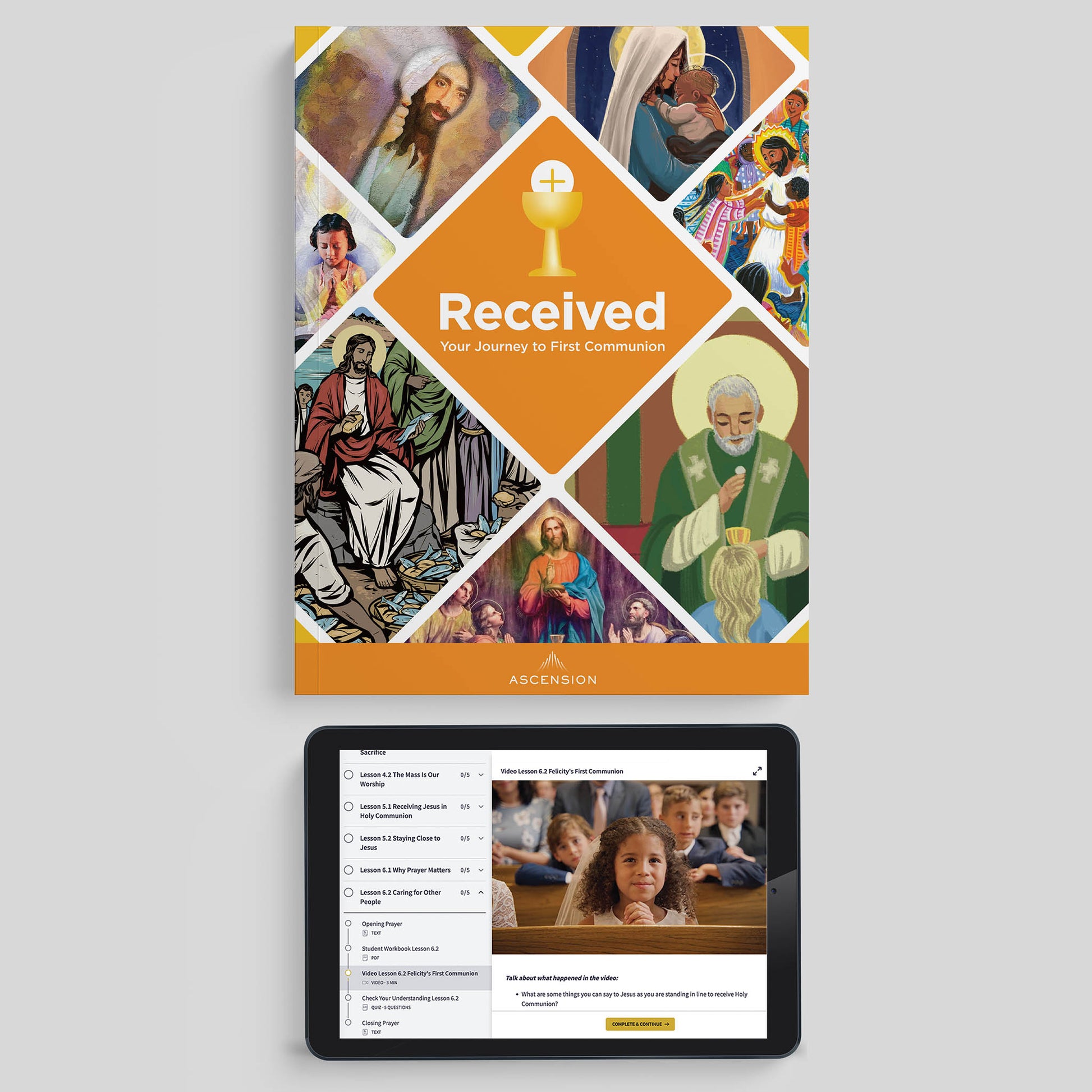 The Received: Your Journey to First Communion Student Workbook seamlessly integrates with the videos and includes 12 lessons with hands-on activities, prayers, saint connections, main content teaching, Visio Divina, Bible stories, car conversation, take-home activities, discussion questions, and more. It also includes the Online Course with all 12 videos.